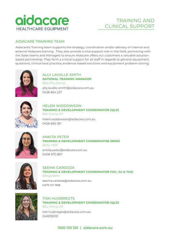 Our Aidacare Professional Training (APT) program aims to provide all health care providers, such as Allied Health Professionals, nurses, case managers, carers and other medical professionals, with the most up-to-date and relevant professional training in regards to Assistive Technology Equipment. The APT program is a rolling series of educational workshops conducted in all states. APT Workshops are conducted by our qualified staff (OT and Physio) and product specific experts.